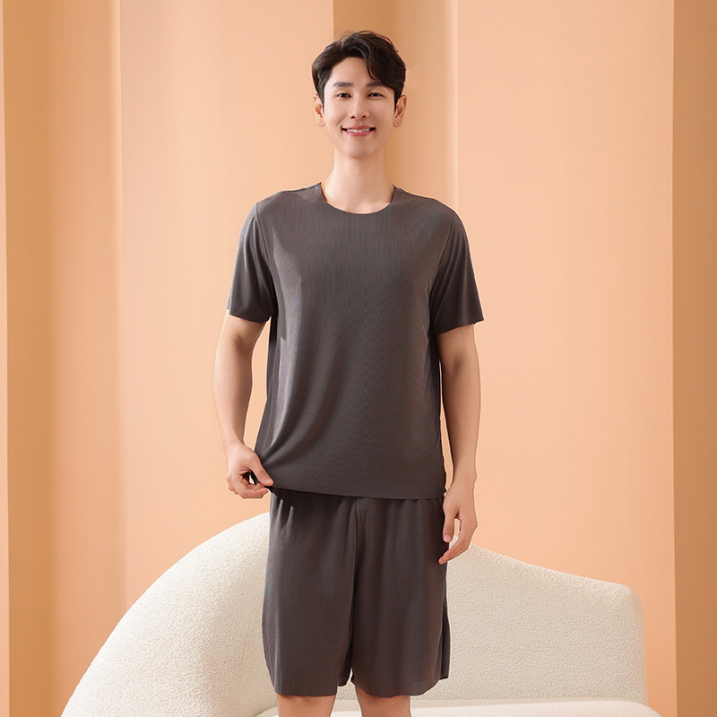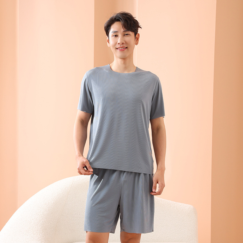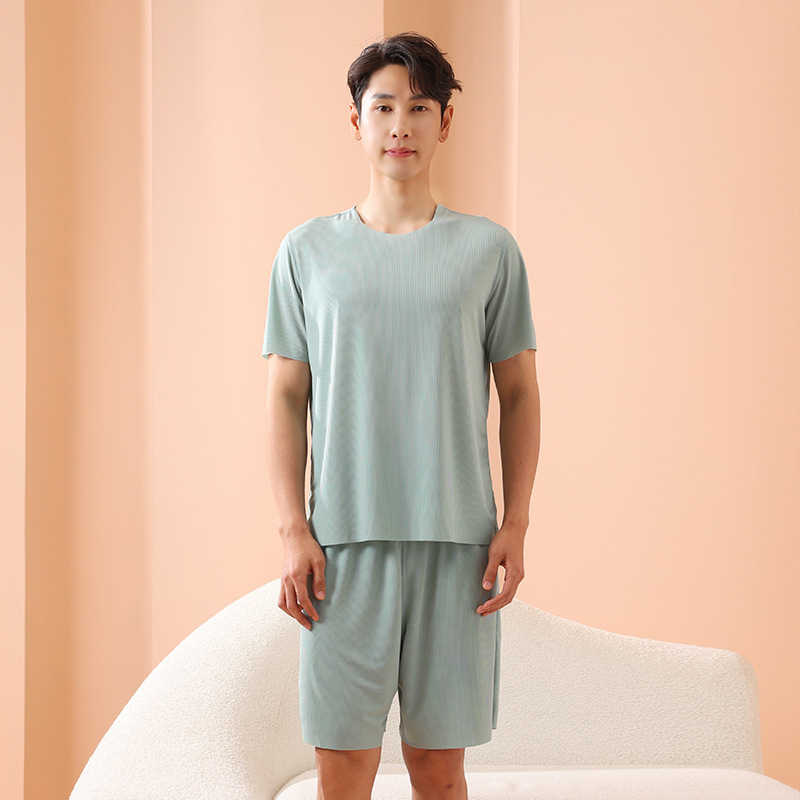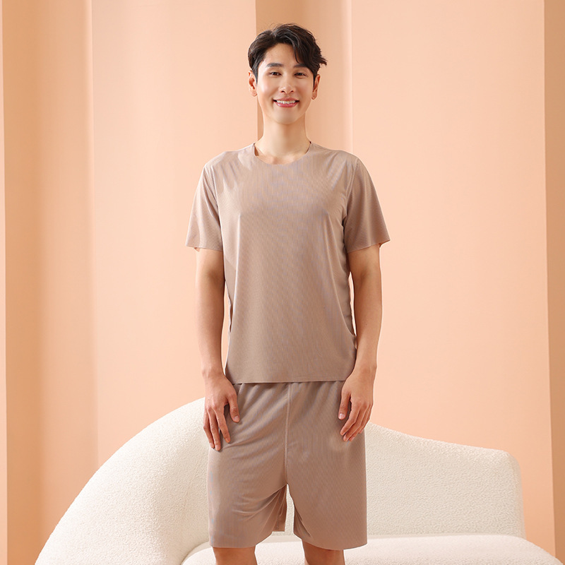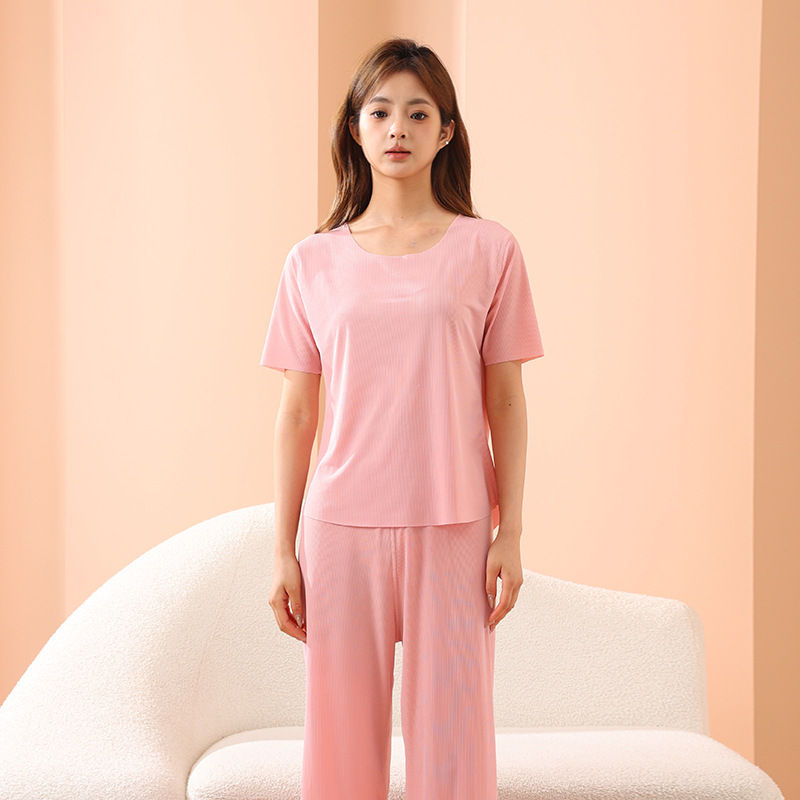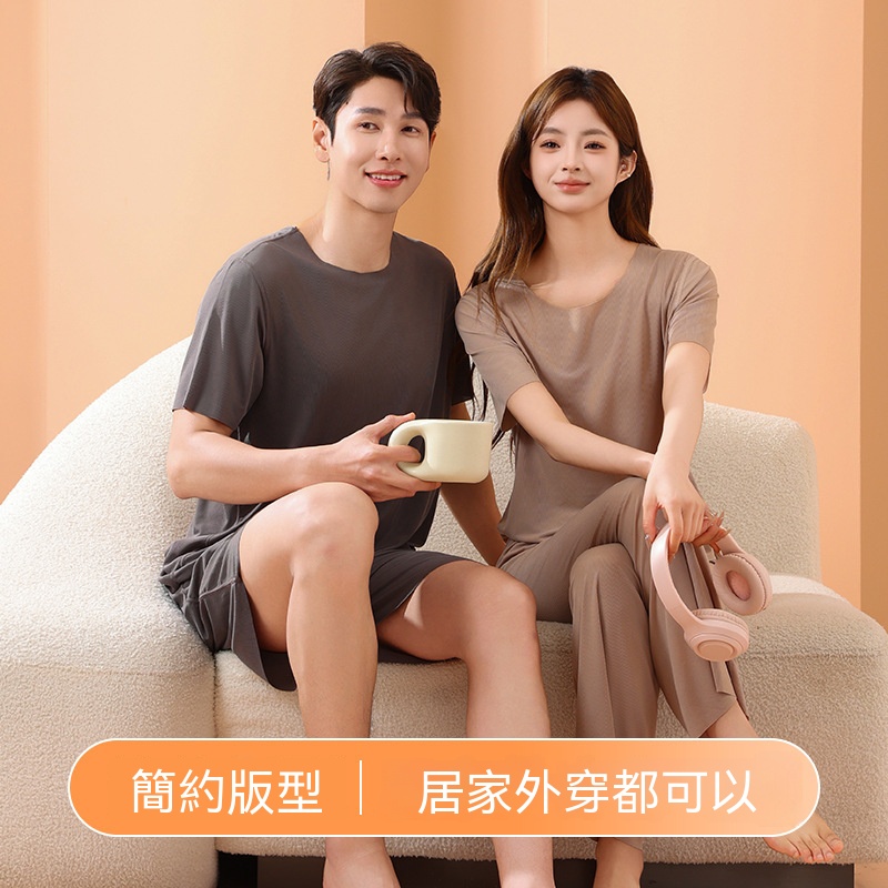 情侶款涼感睡衣 夏季冰絲螺紋薄款 短袖長褲可外穿 情侶家居服套裝