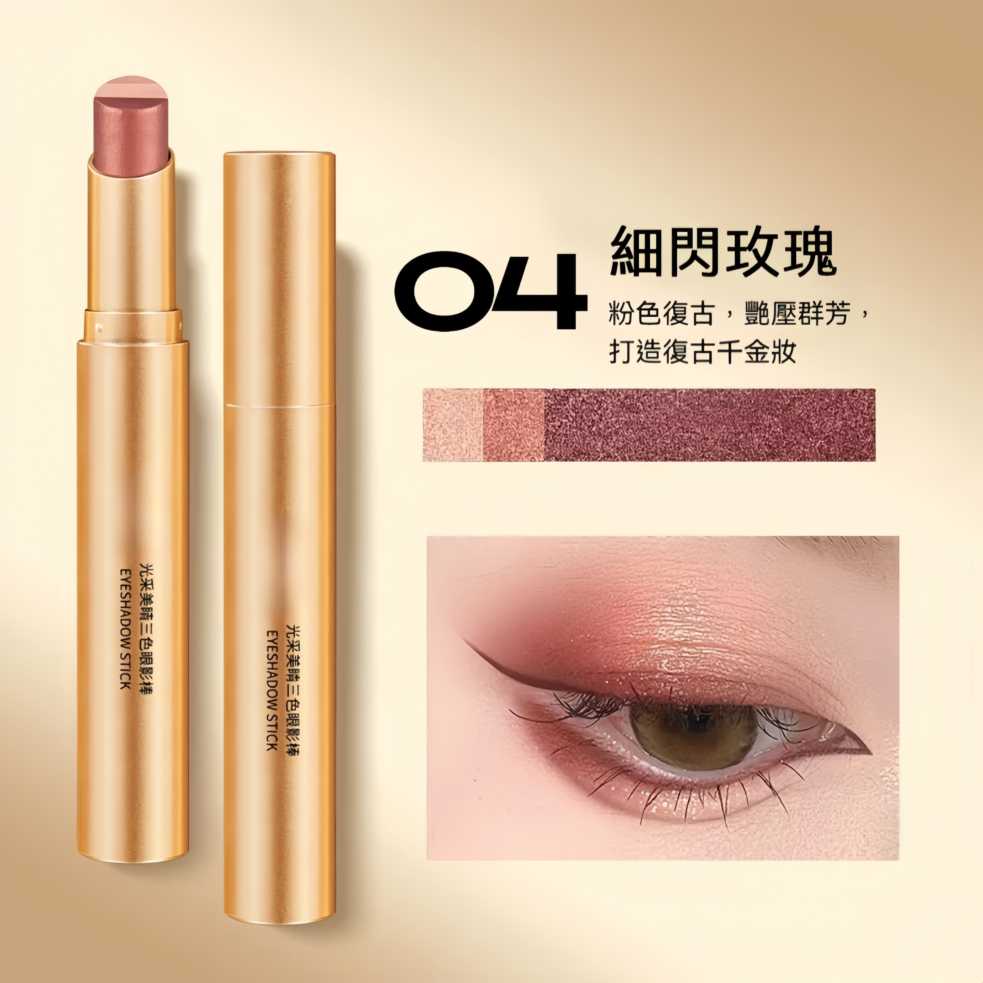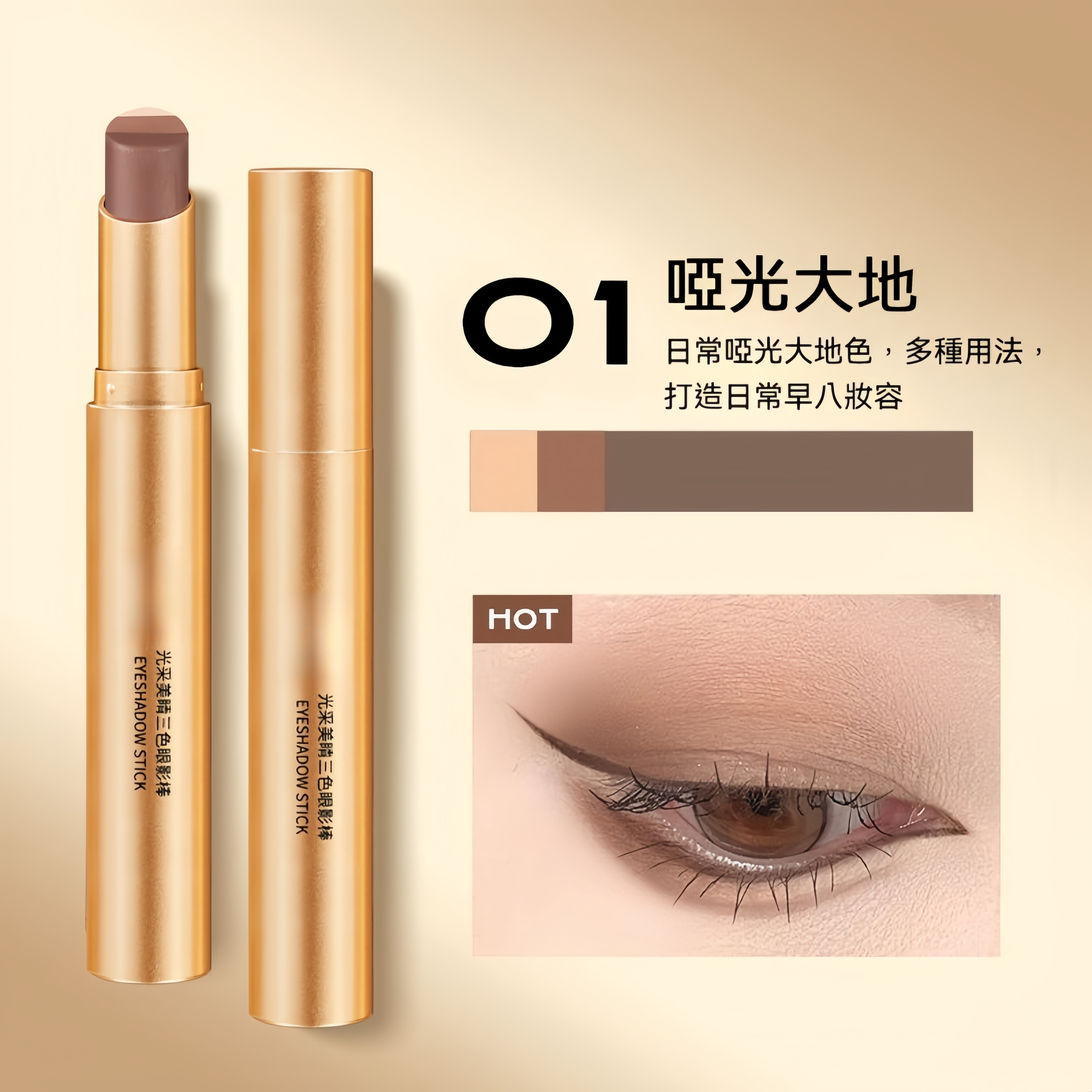 3秒成妝 一抹【三色漸變眼影棒】防水、防汗 粉質軟糯細膩 絲滑流暢 輕盈服帖不飛粉 一塗一抹,幻化出動人的閃亮眼妝!